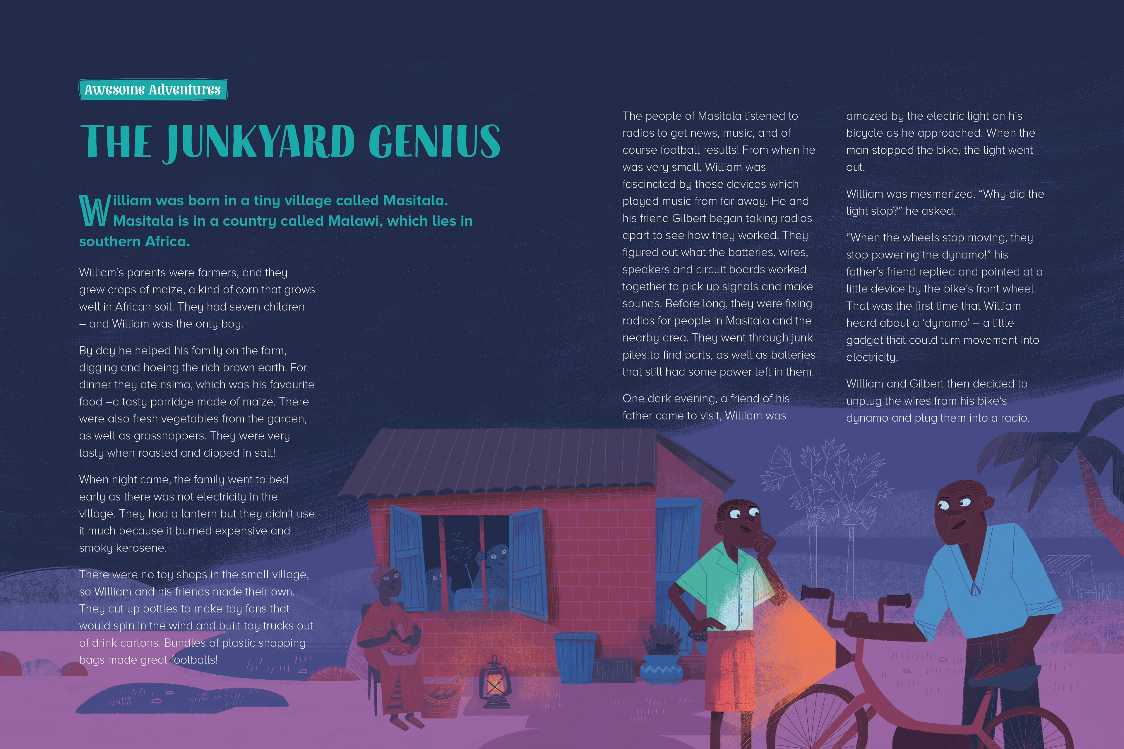 electricity-producing windmill from spare parts and scrap, an idea that would change his family’s life forever! His story is also told in the film "The boy who harnessed the Wind"